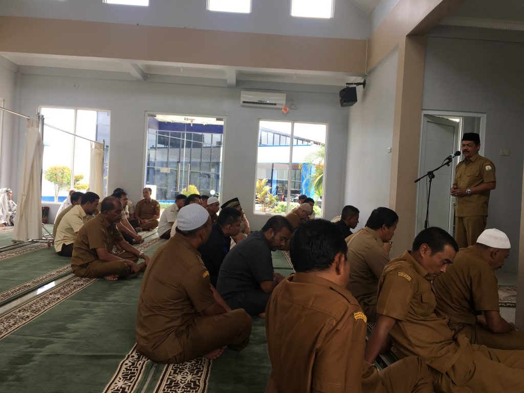 Kepala Dinas Perpustakaan dan Kearsipan Aceh, Dr. Wildan, M.P.d memberikan tausiah usai sholat Dzuhur berjamaah, di mushola kantor Dinas Arpus Aceh, Selasa (7/5).