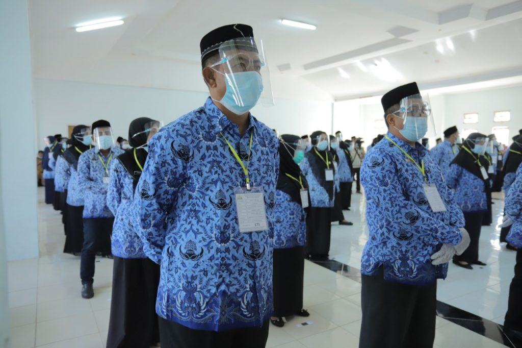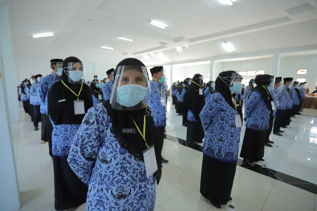 Pelantikan berlangsung dengan menerapkan protokol kesehatan. Memakai masker dan faceshield, serta menjaga jarak.
